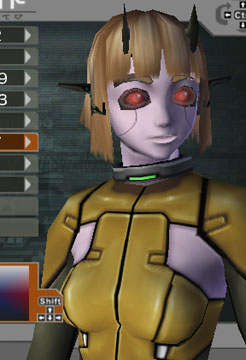 | A dude with pointy ear-things. He has a snub horn and single face-split. This would definetaly be better looking if it didn't have the eye glitch. It's impossible to tell how he'd look without it. The long hair gives a totally new look to the android type. | |||||||||||||||||||||||||||