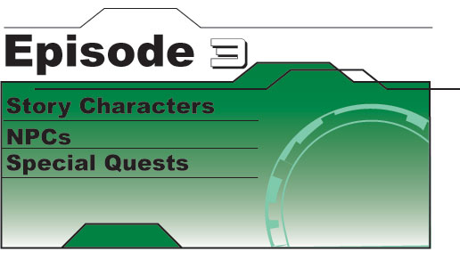 | Episode 3 is filled with tons of plot, compared to all of the other episodes. Here, you can find both the Hero and Arkz side playable characters' stories, as well as the NPCs mentioned such as government workers, various scientists, and bosses. Episode 3 also seems to have its share of special quests with new and unique characters as well as the return of some old ones. Select from the menu above which you would like to view. | ||||
